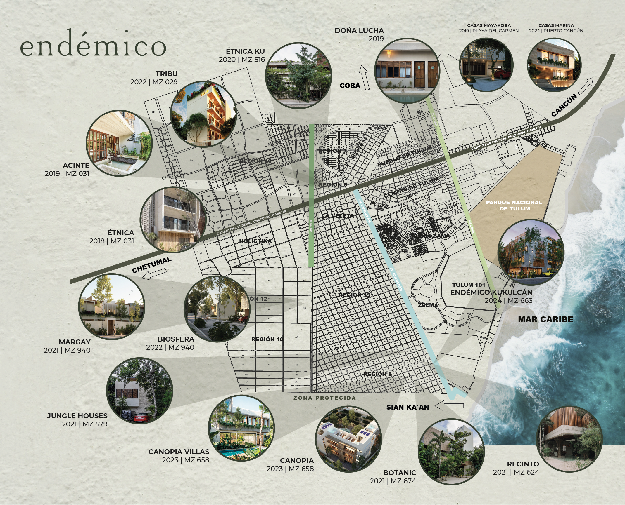 With more than 11 completed developments and a strong presence in Tulum, Grupo Endémico offers projects with architectural identity, preserved green areas, and a sustainable approach. Choose from Canopia, Kukulcán, Botanic, Jungle House, Canopia Villas, and more, backing your investment with proven experience and trajectory.